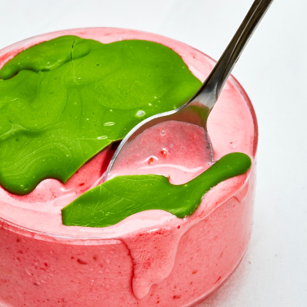 It goes like this: Blend a single-serving cup of plain Greek yogurt with about a cup of frozen berries, a splash of cream if you want, and a few spoons of sugar. Freeze, done. Much like a classic French yogurt cake where the ingredients are measured directly in the yogurt cup, I’ve found that a heaped yogurt cup’s worth of frozen fruit is exactly the right amount to yield something fruity and creamy but not watered down. A short spell in the freezer takes it from “is this a smoothie bowl?” to “do you have a Froyo machine?” The white-chocolate-matcha shell on top is entirely unessential but irresistibly fun, a vibrant green sheath splashed over the pink yogurt (resembling the layered lattes we know and love).